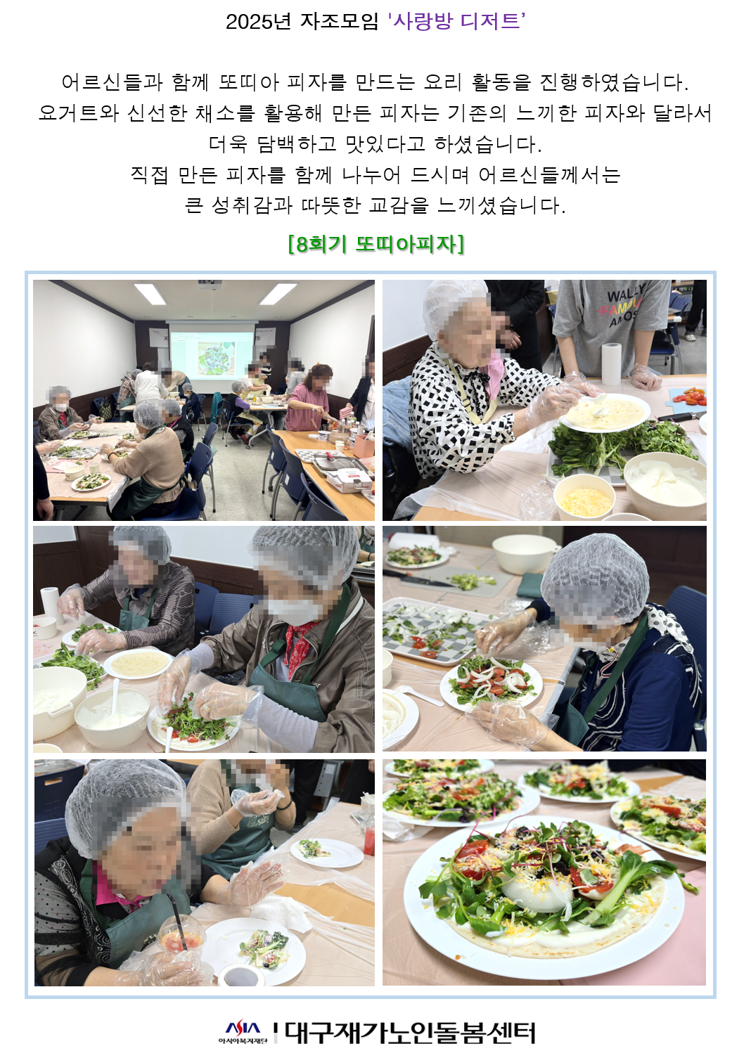 시설소개 재가노인지원서비스 노인맞춤돌봄서비스 정보마당 후원/자원봉사 인사말 법인소개 연혁 조직도 오시는 길 공지사항 갤러리 후원 안내 자원봉사 안내 시설소개 인사말 법인소개 연혁 조직도 오시는 길 재가노인지원서비스 노인맞춤돌봄서비스 정보마당 공지사항 갤러리 후원/자원봉사 후원 안내 자원봉사 안내 정보마당 시설소개 재가노인지원서비스 노인맞춤돌봄서비스 정보마당 후원/자원봉사 갤러리 공지사항 갤러리 갤러리 [맞춤돌봄]자조모임 8회기- 또띠아피자 맞춤돌봄, 2025-05-09 ( 조회수 126 )