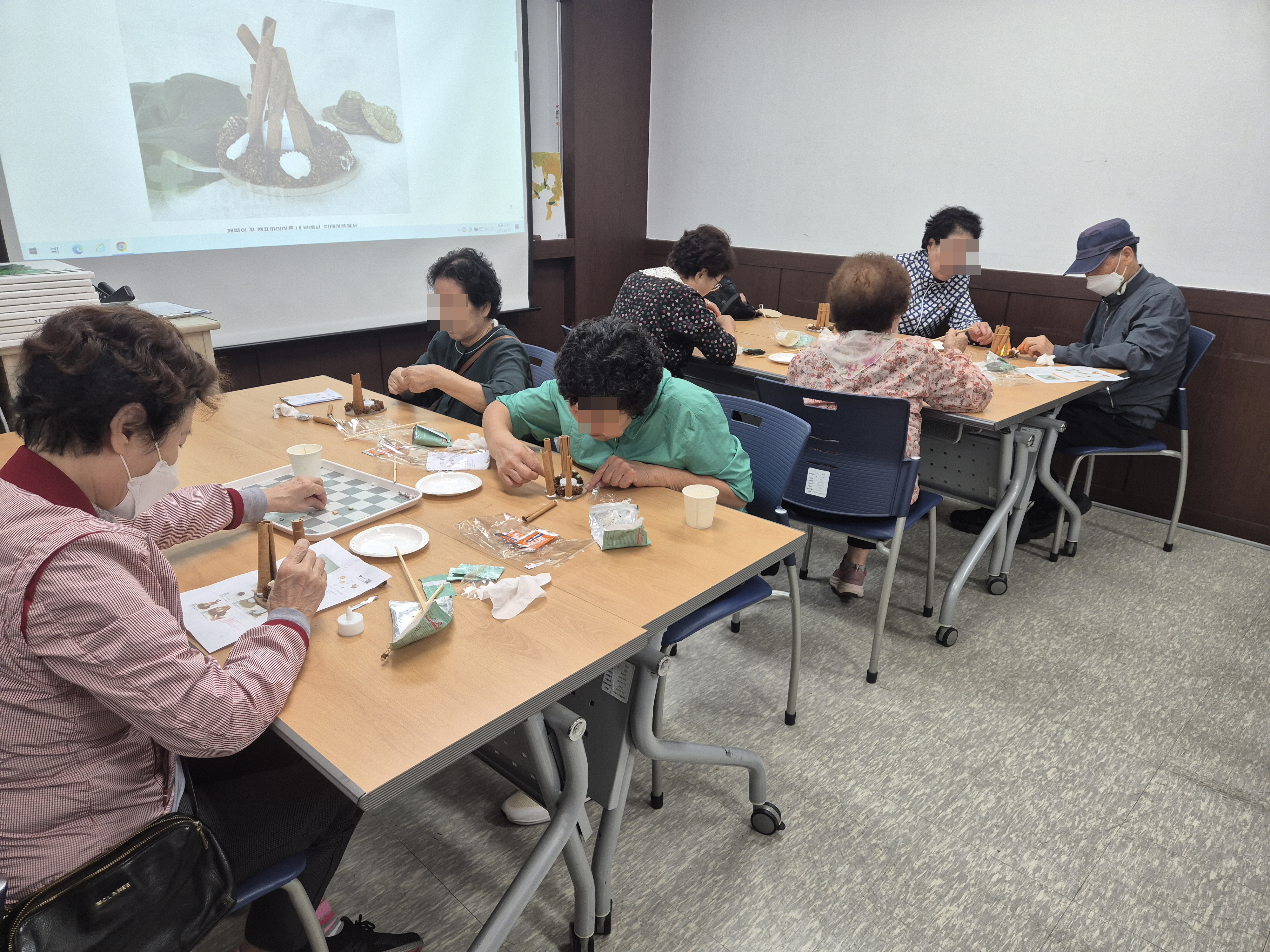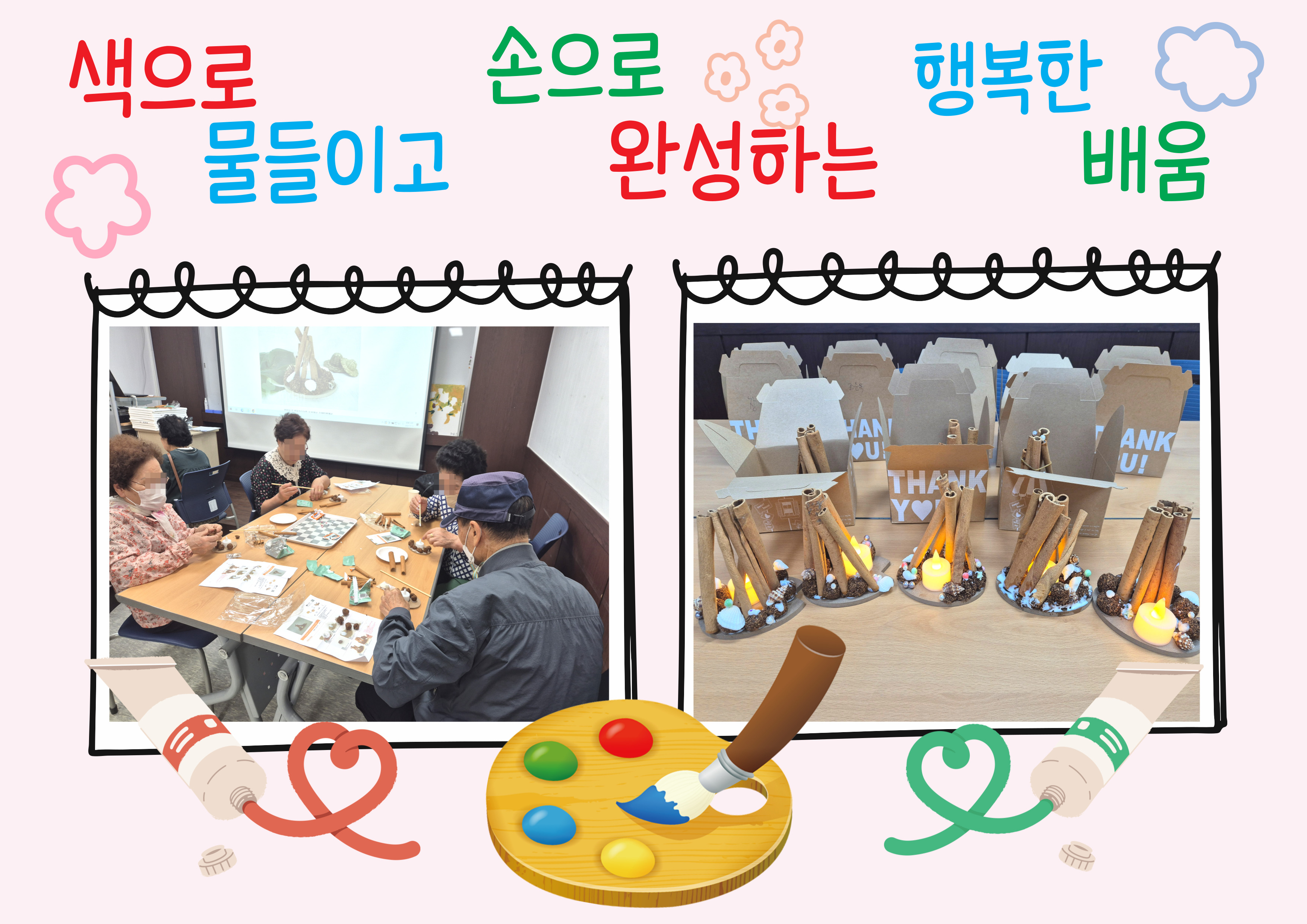 ![]() ![]() ![]() [평생교육 1회기- 시나몬 무드등] 손으로 작품을 만드시며 집중력과 성취감을 높일 수 있었으며, 은은한 시나몬 향과 따뜻한 조명이 잘 어우러져 예쁘다고 말씀하셨습니다. 또한 서로의 결과물을 감상하며 자연스럽게 대화를 나누시고 즐거운 하시는 모습을 볼 수 있었습니다.