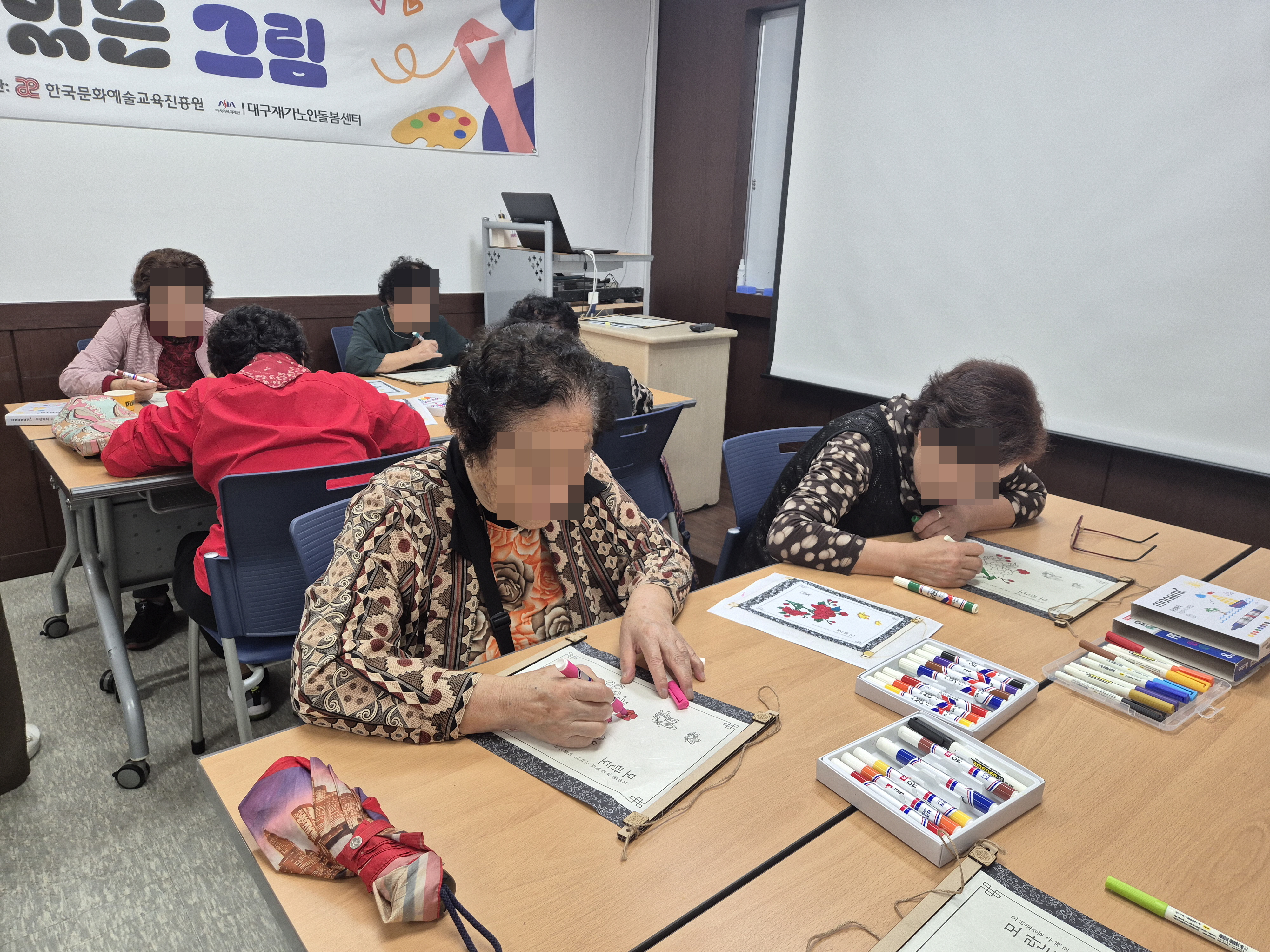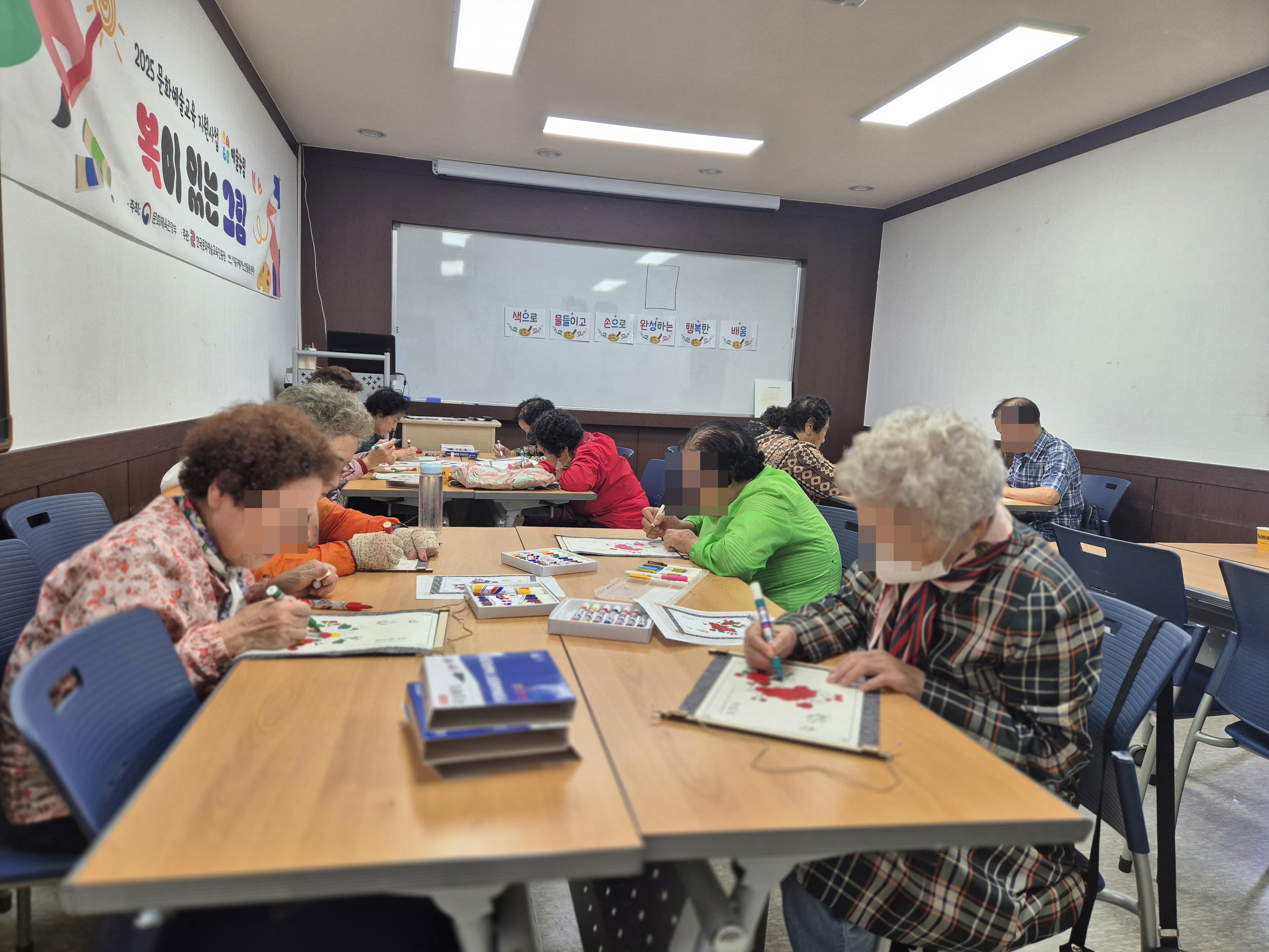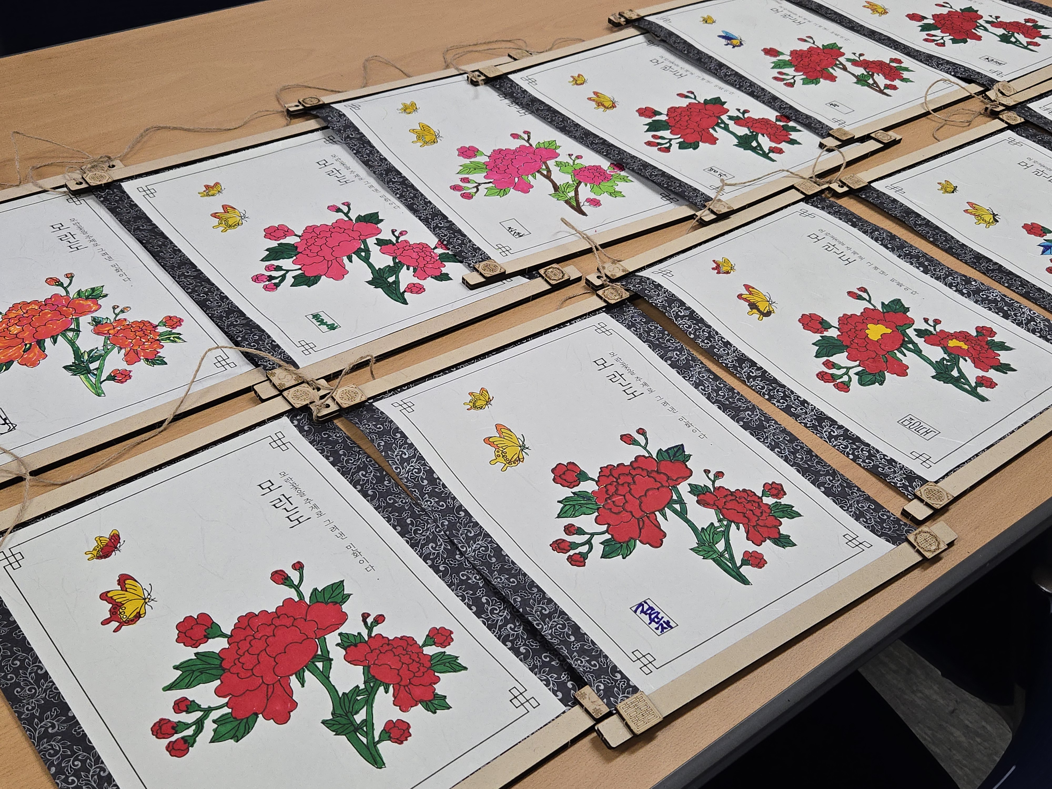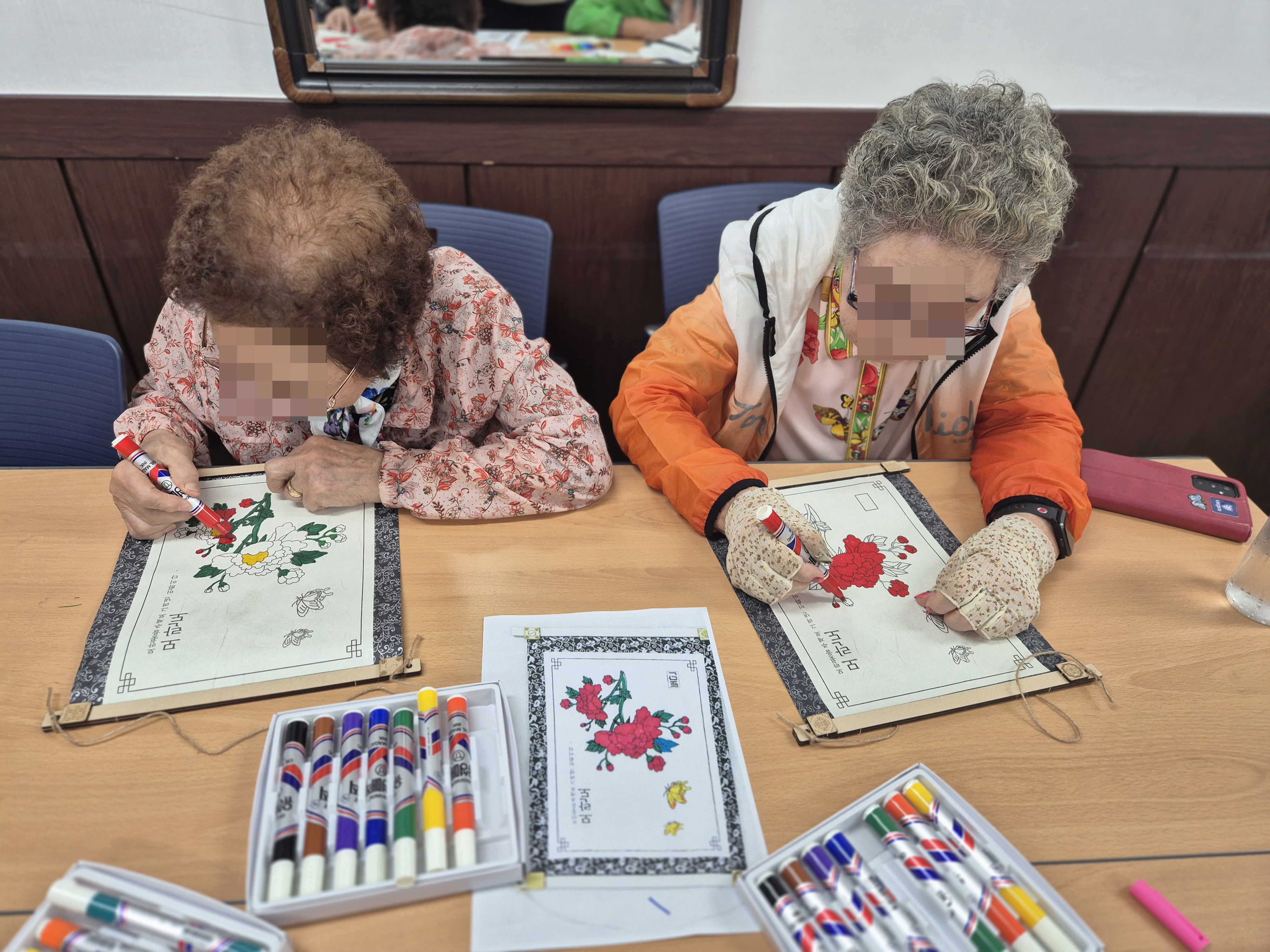 [평생교육 2회기- 모란도 족자] 전통 문양 색칠을 통해 집중력과 손 근육을 강화하고 완성된 작품을 보며 성취감을 느낄 수 있는 시간이였습니다. 예쁘게 색칠된 족자를 집에 걸어두면 복이 들어올 것 같다라고 말씀하시며 즐거워하셨습니다.