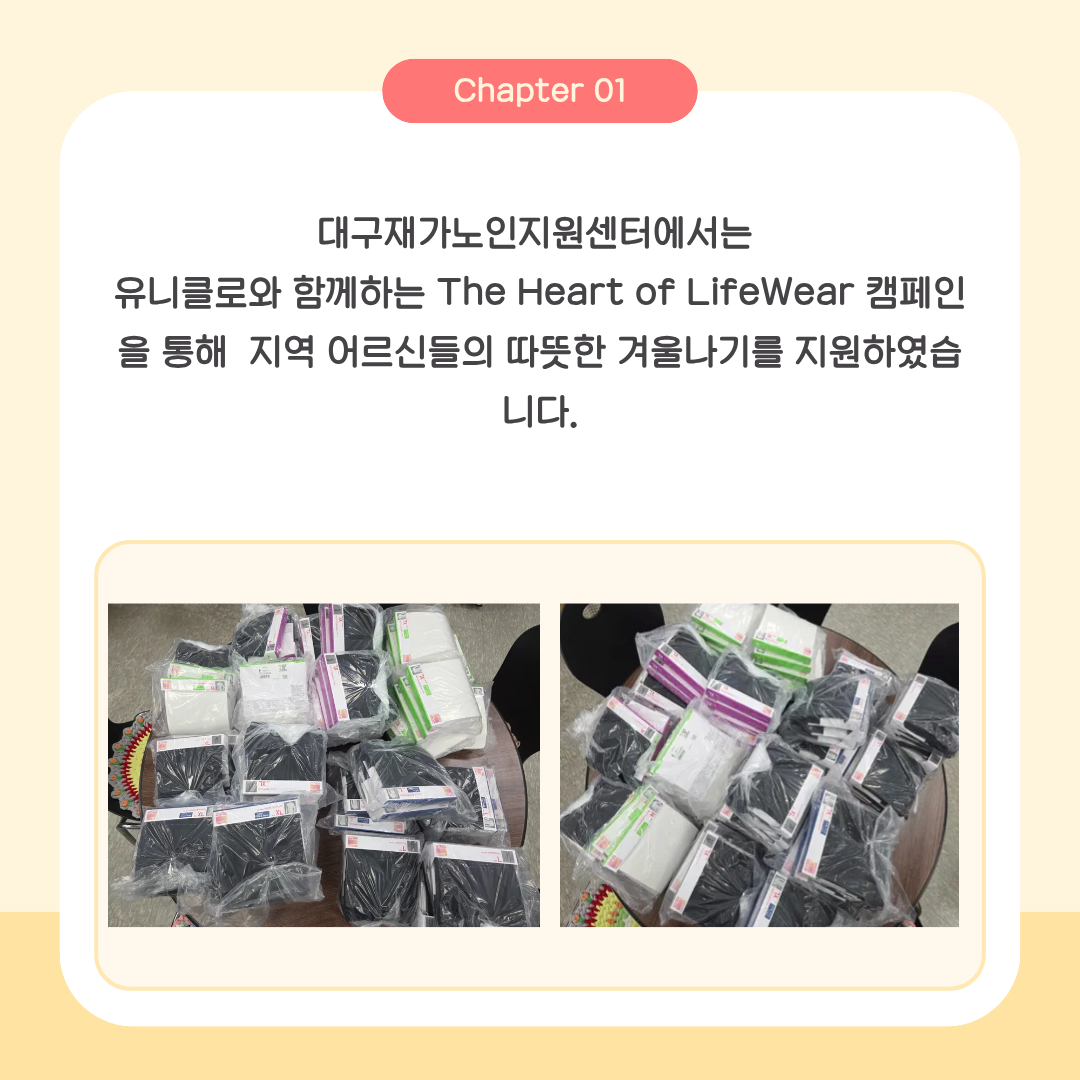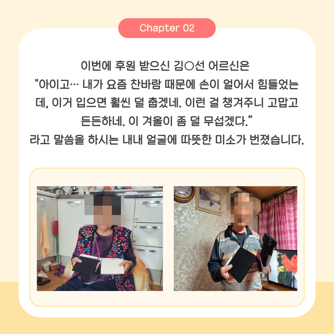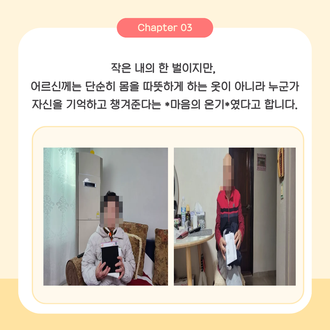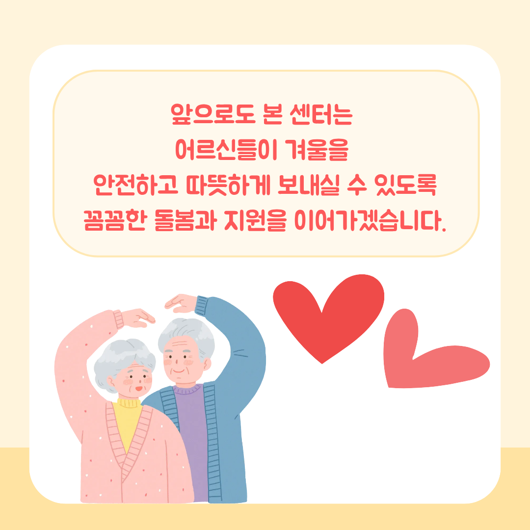 시설소개 재가노인지원서비스 노인맞춤돌봄서비스 정보마당 후원/자원봉사 인사말 법인소개 연혁 조직도 오시는 길 공지사항 갤러리 후원 안내 자원봉사 안내 시설소개 인사말 법인소개 연혁 조직도 오시는 길 재가노인지원서비스 노인맞춤돌봄서비스 정보마당 공지사항 갤러리 후원/자원봉사 후원 안내 자원봉사 안내 정보마당 시설소개 재가노인지원서비스 노인맞춤돌봄서비스 정보마당 후원/자원봉사 갤러리 공지사항 갤러리 갤러리 [맞돌] 연계서비스 혹한기 대비 히트텍 지원 맞춤돌봄, 2025-12-05 ( 조회수 33 )