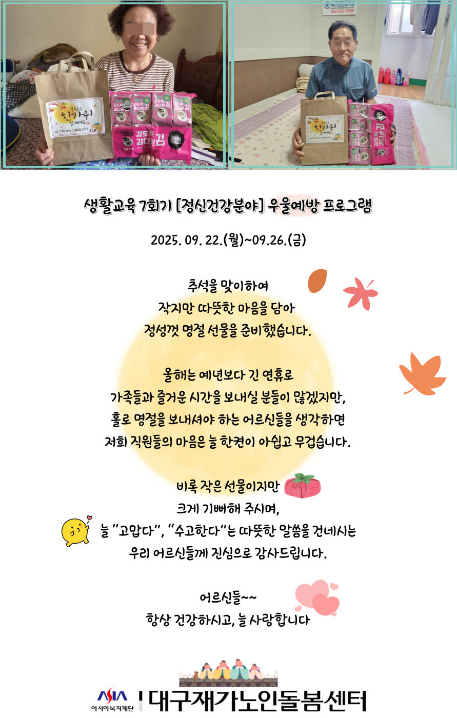 시설소개 재가노인지원서비스 노인맞춤돌봄서비스 정보마당 후원/자원봉사 인사말 법인소개 연혁 조직도 오시는 길 공지사항 갤러리 후원 안내 자원봉사 안내 시설소개 인사말 법인소개 연혁 조직도 오시는 길 재가노인지원서비스 노인맞춤돌봄서비스 정보마당 공지사항 갤러리 후원/자원봉사 후원 안내 자원봉사 안내 정보마당 시설소개 재가노인지원서비스 노인맞춤돌봄서비스 정보마당 후원/자원봉사 갤러리 공지사항 갤러리 갤러리 [맞돌][생활교육] 정신건강 - 정서지원 맞춤돌봄, 2025-12-09 ( 조회수 149 )