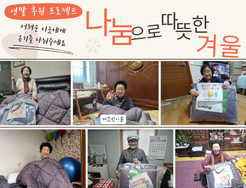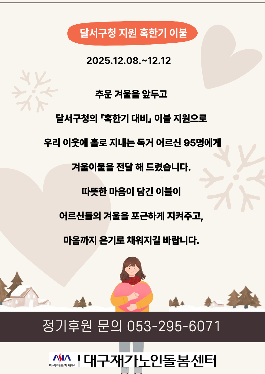 시설소개 재가노인지원서비스 노인맞춤돌봄서비스 정보마당 후원/자원봉사 인사말 법인소개 연혁 조직도 오시는 길 공지사항 갤러리 후원 안내 자원봉사 안내 시설소개 인사말 법인소개 연혁 조직도 오시는 길 재가노인지원서비스 노인맞춤돌봄서비스 정보마당 공지사항 갤러리 후원/자원봉사 후원 안내 자원봉사 안내 정보마당 시설소개 재가노인지원서비스 노인맞춤돌봄서비스 정보마당 후원/자원봉사 갤러리 공지사항 갤러리 갤러리 [맞돌][연계서비스] 혹한기 대비 달서구청 이불 지원 맞춤돌봄, 2026-01-31 ( 조회수 66 )