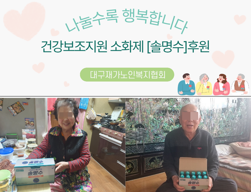 시설소개 재가노인지원서비스 노인맞춤돌봄서비스 정보마당 후원/자원봉사 인사말 법인소개 연혁 조직도 오시는 길 공지사항 갤러리 후원 안내 자원봉사 안내 시설소개 인사말 법인소개 연혁 조직도 오시는 길 재가노인지원서비스 노인맞춤돌봄서비스 정보마당 공지사항 갤러리 후원/자원봉사 후원 안내 자원봉사 안내 정보마당 시설소개 재가노인지원서비스 노인맞춤돌봄서비스 정보마당 후원/자원봉사 갤러리 공지사항 갤러리 갤러리 [맞돌][연계서비스] 소화제 솔명수 후원 맞춤돌봄, 2026-02-06 ( 조회수 95 )