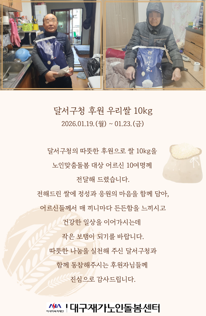 시설소개 재가노인지원서비스 노인맞춤돌봄서비스 정보마당 후원/자원봉사 인사말 법인소개 연혁 조직도 오시는 길 공지사항 갤러리 후원 안내 자원봉사 안내 시설소개 인사말 법인소개 연혁 조직도 오시는 길 재가노인지원서비스 노인맞춤돌봄서비스 정보마당 공지사항 갤러리 후원/자원봉사 후원 안내 자원봉사 안내 정보마당 시설소개 재가노인지원서비스 노인맞춤돌봄서비스 정보마당 후원/자원봉사 갤러리 공지사항 갤러리 갤러리 [맞돌][연계서비스] 달서구청후원 우리쌀 10kg 지원 맞춤돌봄, 2026-02-06 ( 조회수 79 )