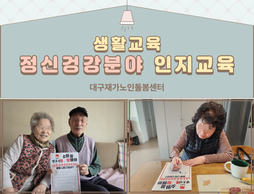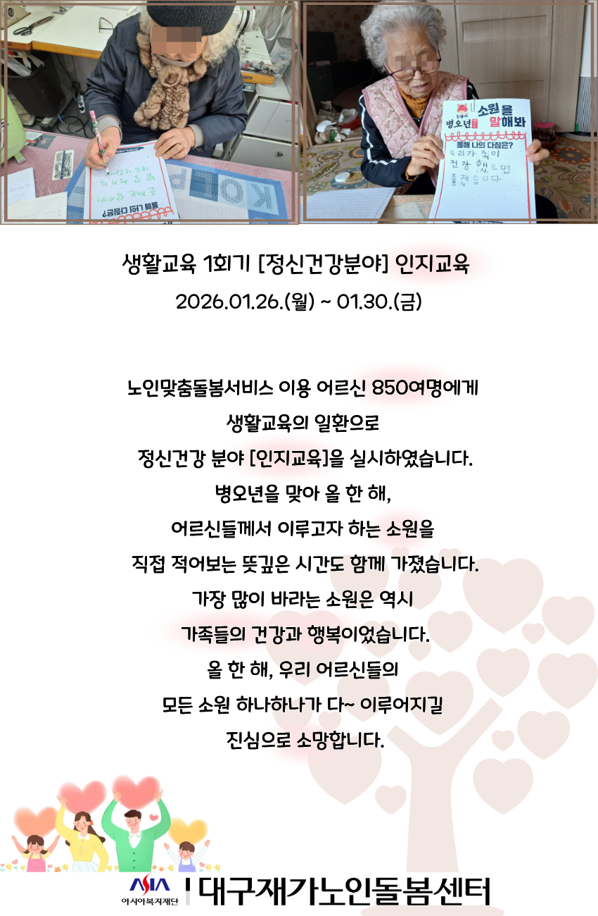 시설소개 재가노인지원서비스 노인맞춤돌봄서비스 정보마당 후원/자원봉사 인사말 법인소개 연혁 조직도 오시는 길 공지사항 갤러리 후원 안내 자원봉사 안내 시설소개 인사말 법인소개 연혁 조직도 오시는 길 재가노인지원서비스 노인맞춤돌봄서비스 정보마당 공지사항 갤러리 후원/자원봉사 후원 안내 자원봉사 안내 정보마당 시설소개 재가노인지원서비스 노인맞춤돌봄서비스 정보마당 후원/자원봉사 갤러리 공지사항 갤러리 갤러리 [맞돌][생활교육] 정신건강분-인지활동프로그램 맞춤돌봄, 2026-02-06 ( 조회수 51 )