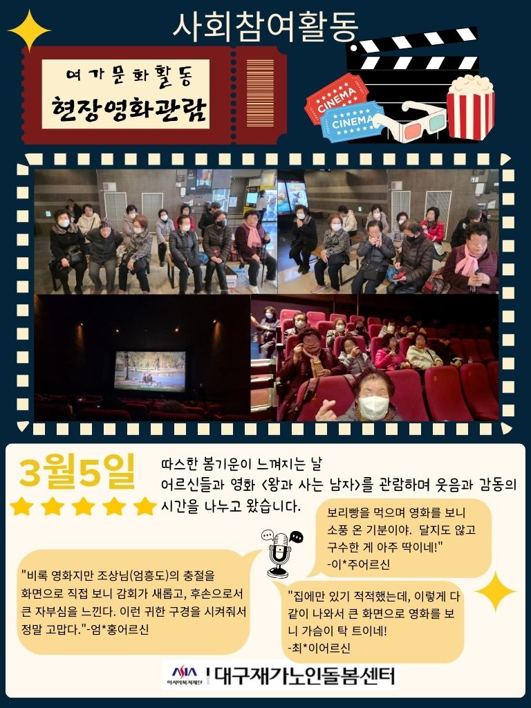 시설소개 재가노인지원서비스 노인맞춤돌봄서비스 정보마당 후원/자원봉사 인사말 법인소개 연혁 조직도 오시는 길 공지사항 갤러리 후원 안내 자원봉사 안내 시설소개 인사말 법인소개 연혁 조직도 오시는 길 재가노인지원서비스 노인맞춤돌봄서비스 정보마당 공지사항 갤러리 후원/자원봉사 후원 안내 자원봉사 안내 정보마당 시설소개 재가노인지원서비스 노인맞춤돌봄서비스 정보마당 후원/자원봉사 갤러리 공지사항 갤러리 갤러리 [맞돌][사회참여]-여가문화-영화관람 맞춤돌봄, 2026-03-06 ( 조회수 71 )