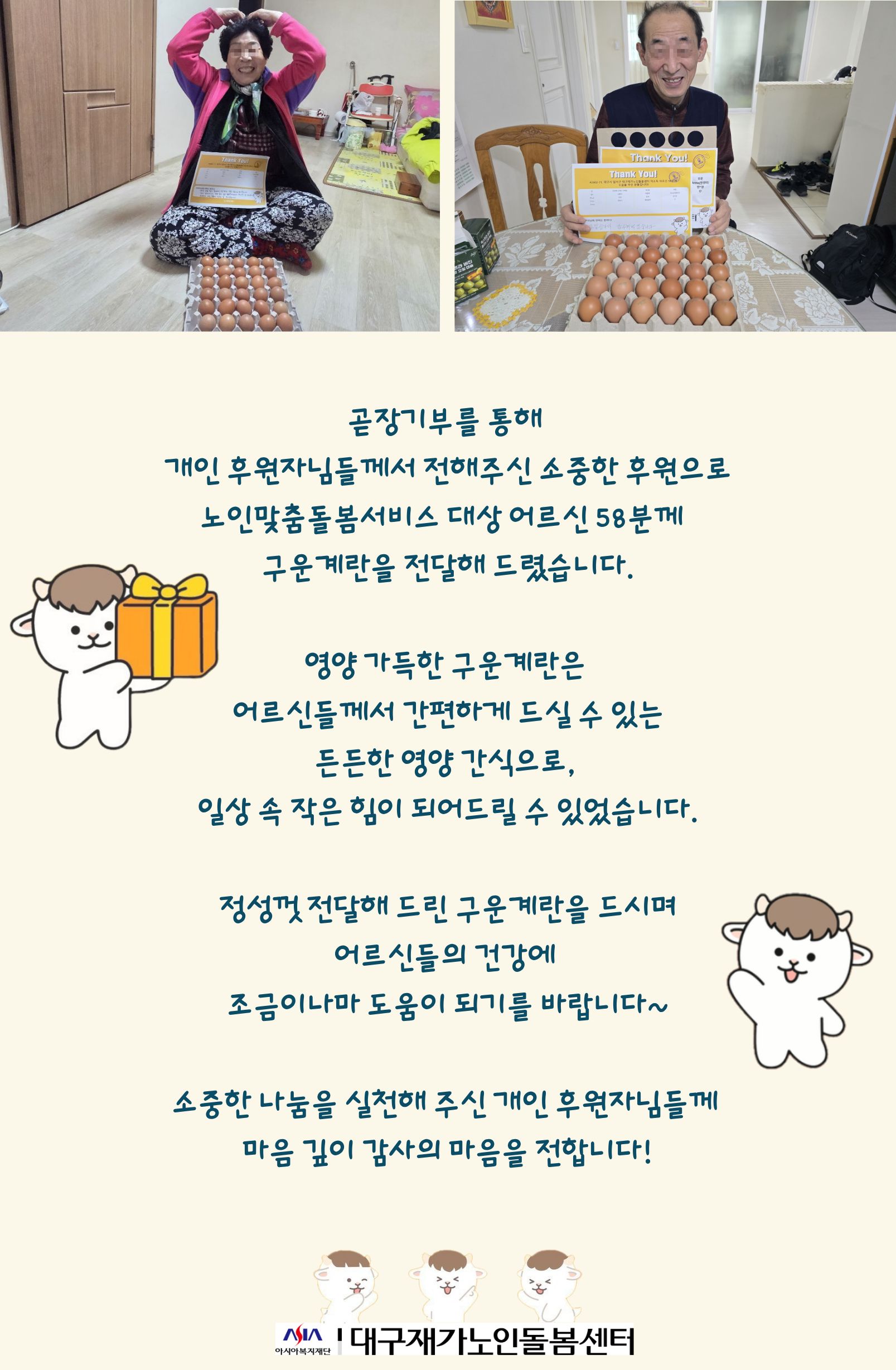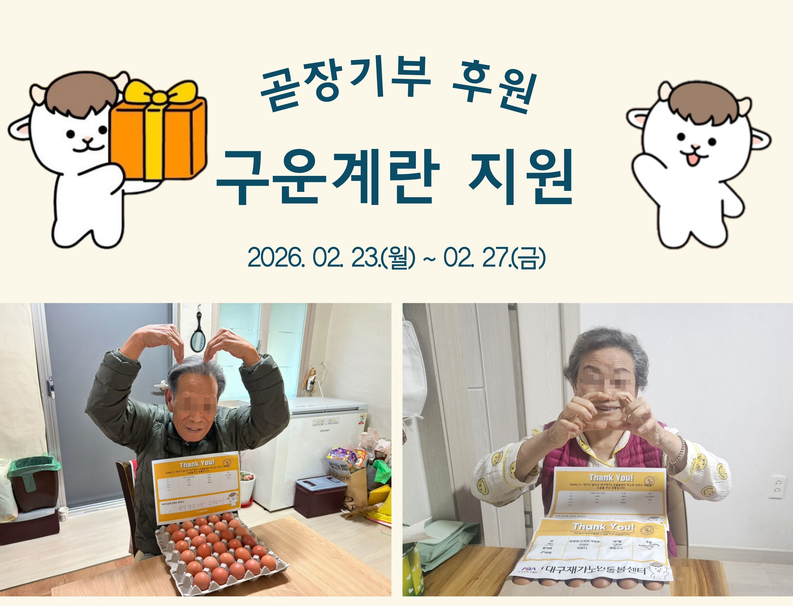 시설소개 재가노인지원서비스 노인맞춤돌봄서비스 정보마당 후원/자원봉사 인사말 법인소개 연혁 조직도 오시는 길 공지사항 갤러리 후원 안내 자원봉사 안내 시설소개 인사말 법인소개 연혁 조직도 오시는 길 재가노인지원서비스 노인맞춤돌봄서비스 정보마당 공지사항 갤러리 후원/자원봉사 후원 안내 자원봉사 안내 정보마당 시설소개 재가노인지원서비스 노인맞춤돌봄서비스 정보마당 후원/자원봉사 갤러리 공지사항 갤러리 갤러리 [맞돌][연계서비스] 곧장기부 후원 구운계란 지원 맞춤돌봄, 2026-03-07 ( 조회수 35 )