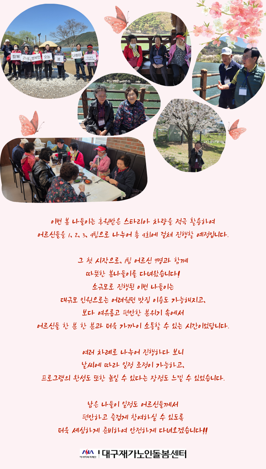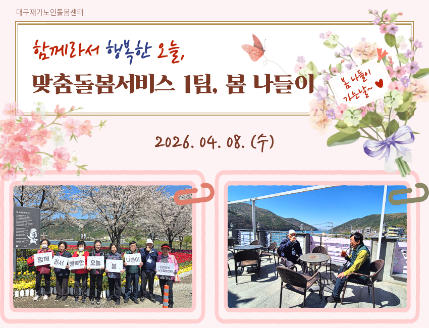 시설소개 재가노인지원서비스 노인맞춤돌봄서비스 정보마당 후원/자원봉사 인사말 법인소개 연혁 조직도 오시는 길 공지사항 갤러리 후원 안내 자원봉사 안내 시설소개 인사말 법인소개 연혁 조직도 오시는 길 재가노인지원서비스 노인맞춤돌봄서비스 정보마당 공지사항 갤러리 후원/자원봉사 후원 안내 자원봉사 안내 정보마당 시설소개 재가노인지원서비스 노인맞춤돌봄서비스 정보마당 후원/자원봉사 갤러리 공지사항 갤러리 갤러리 [맞춤돌봄] 사회관계향상프로그램-1팀 함께라서 행복한 오늘 봄나들이 맞춤돌봄, 2026-04-13 ( 조회수 55 )