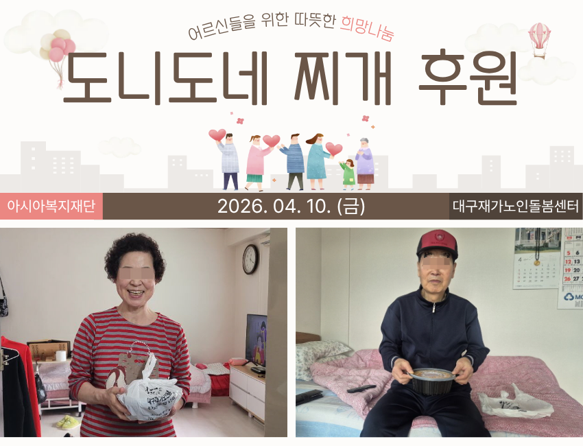 시설소개 재가노인지원서비스 노인맞춤돌봄서비스 정보마당 후원/자원봉사 인사말 법인소개 연혁 조직도 오시는 길 공지사항 갤러리 후원 안내 자원봉사 안내 시설소개 인사말 법인소개 연혁 조직도 오시는 길 재가노인지원서비스 노인맞춤돌봄서비스 정보마당 공지사항 갤러리 후원/자원봉사 후원 안내 자원봉사 안내 정보마당 시설소개 재가노인지원서비스 노인맞춤돌봄서비스 정보마당 후원/자원봉사 갤러리 공지사항 갤러리 갤러리 [맞춤돌봄] 연계서비스-도니도네 찌개 후 맞춤돌봄, 2026-04-17 ( 조회수 33 )