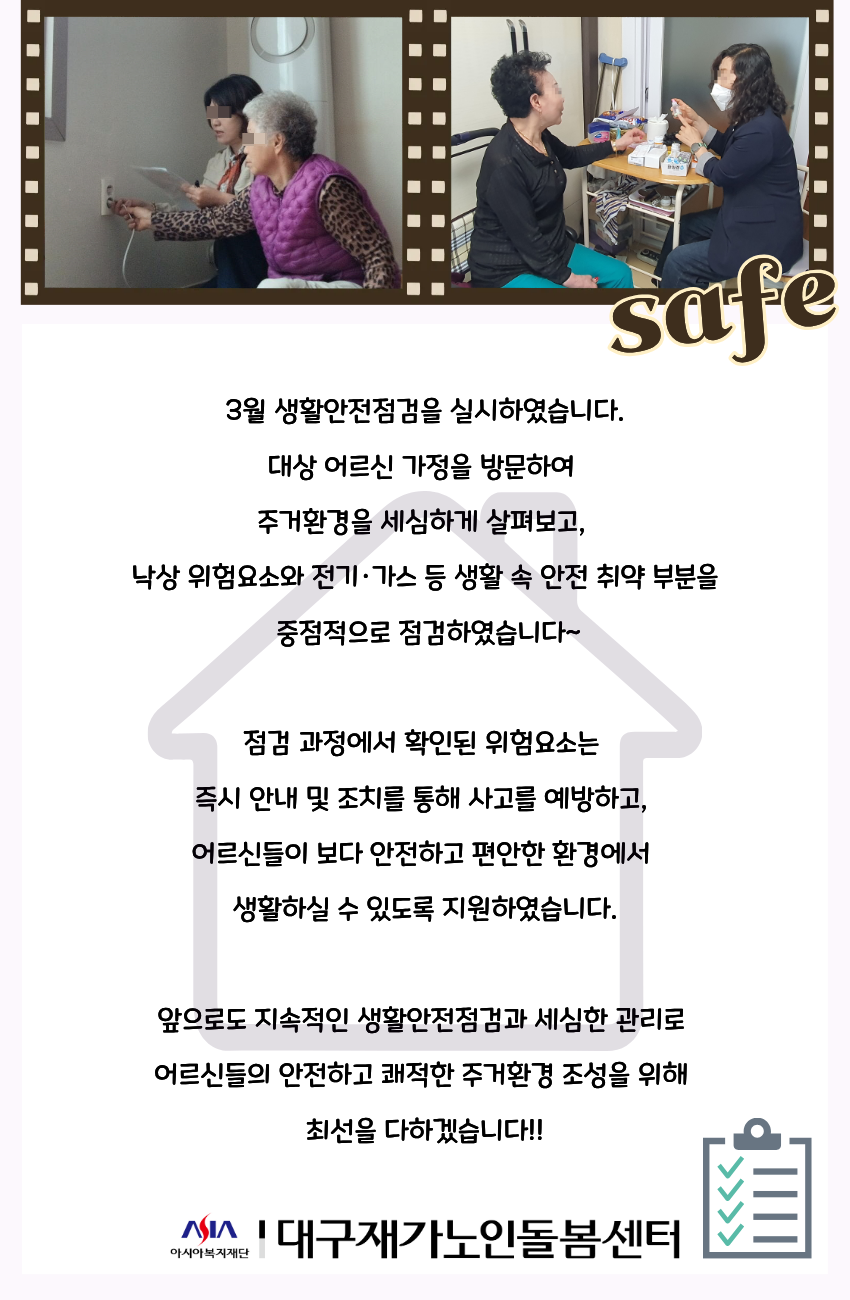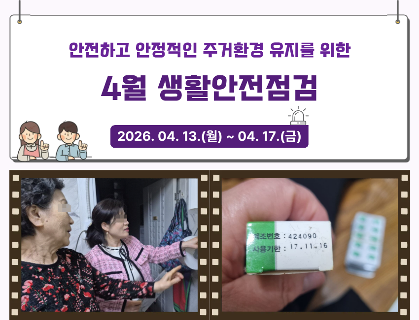 시설소개 재가노인지원서비스 노인맞춤돌봄서비스 정보마당 후원/자원봉사 인사말 법인소개 연혁 조직도 오시는 길 공지사항 갤러리 후원 안내 자원봉사 안내 시설소개 인사말 법인소개 연혁 조직도 오시는 길 재가노인지원서비스 노인맞춤돌봄서비스 정보마당 공지사항 갤러리 후원/자원봉사 후원 안내 자원봉사 안내 정보마당 시설소개 재가노인지원서비스 노인맞춤돌봄서비스 정보마당 후원/자원봉사 갤러리 공지사항 갤러리 갤러리 [맞춤돌봄] 4월 생활안전점검 실시 맞춤돌봄, 2026-04-18 ( 조회수 49 )