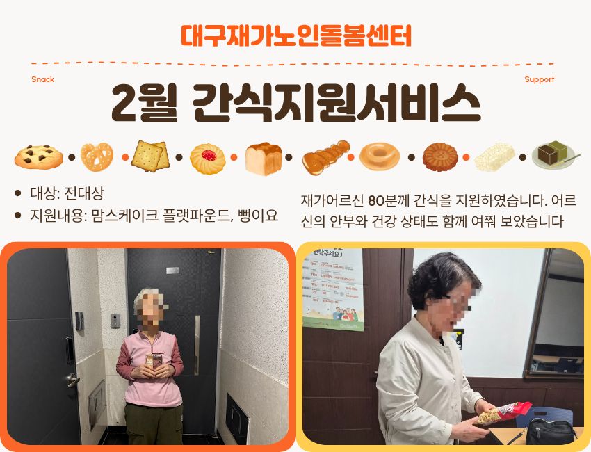 시설소개 재가노인지원서비스 노인맞춤돌봄서비스 정보마당 후원/자원봉사 인사말 법인소개 연혁 조직도 오시는 길 공지사항 갤러리 후원 안내 자원봉사 안내 시설소개 인사말 법인소개 연혁 조직도 오시는 길 재가노인지원서비스 노인맞춤돌봄서비스 정보마당 공지사항 갤러리 후원/자원봉사 후원 안내 자원봉사 안내 정보마당 시설소개 재가노인지원서비스 노인맞춤돌봄서비스 정보마당 후원/자원봉사 갤러리 공지사항 갤러리 갤러리 2월 간식지원서비스 재가지원, 2026-04-23 ( 조회수 20 )