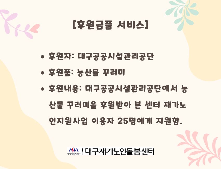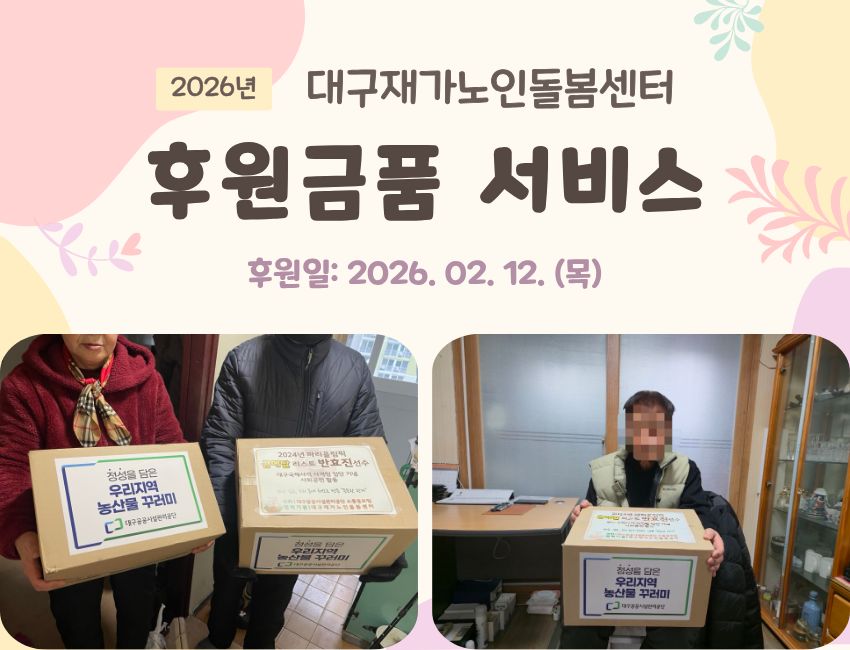 시설소개 재가노인지원서비스 노인맞춤돌봄서비스 정보마당 후원/자원봉사 인사말 법인소개 연혁 조직도 오시는 길 공지사항 갤러리 후원 안내 자원봉사 안내 시설소개 인사말 법인소개 연혁 조직도 오시는 길 재가노인지원서비스 노인맞춤돌봄서비스 정보마당 공지사항 갤러리 후원/자원봉사 후원 안내 자원봉사 안내 정보마당 시설소개 재가노인지원서비스 노인맞춤돌봄서비스 정보마당 후원/자원봉사 갤러리 공지사항 갤러리 갤러리 후원금품서비스 재가지원, 2026-04-23 ( 조회수 28 )