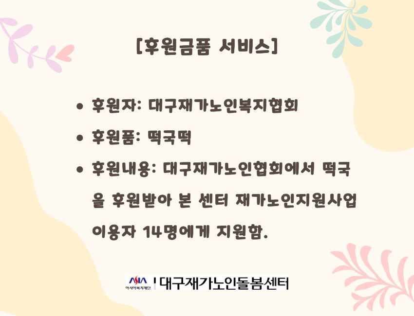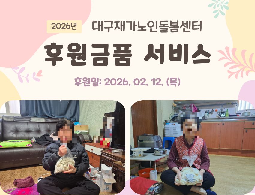 시설소개 재가노인지원서비스 노인맞춤돌봄서비스 정보마당 후원/자원봉사 인사말 법인소개 연혁 조직도 오시는 길 공지사항 갤러리 후원 안내 자원봉사 안내 시설소개 인사말 법인소개 연혁 조직도 오시는 길 재가노인지원서비스 노인맞춤돌봄서비스 정보마당 공지사항 갤러리 후원/자원봉사 후원 안내 자원봉사 안내 정보마당 시설소개 재가노인지원서비스 노인맞춤돌봄서비스 정보마당 후원/자원봉사 갤러리 공지사항 갤러리 갤러리 후원금품서비스 재가지원, 2026-04-23 ( 조회수 29 )