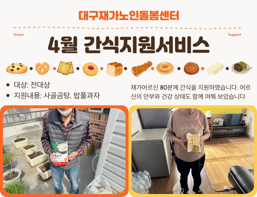 시설소개 재가노인지원서비스 노인맞춤돌봄서비스 정보마당 후원/자원봉사 인사말 법인소개 연혁 조직도 오시는 길 공지사항 갤러리 후원 안내 자원봉사 안내 시설소개 인사말 법인소개 연혁 조직도 오시는 길 재가노인지원서비스 노인맞춤돌봄서비스 정보마당 공지사항 갤러리 후원/자원봉사 후원 안내 자원봉사 안내 정보마당 시설소개 재가노인지원서비스 노인맞춤돌봄서비스 정보마당 후원/자원봉사 갤러리 공지사항 갤러리 갤러리 간식지원서비스 재가지원, 2026-04-28 ( 조회수 15 )