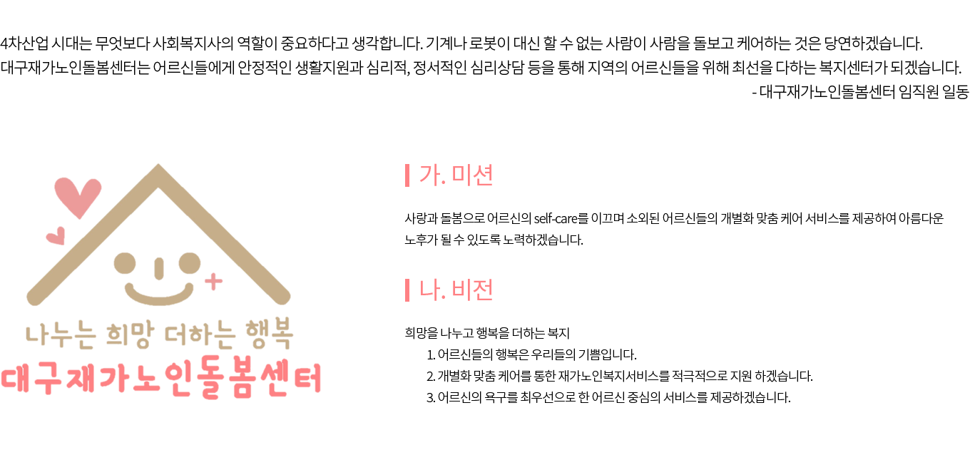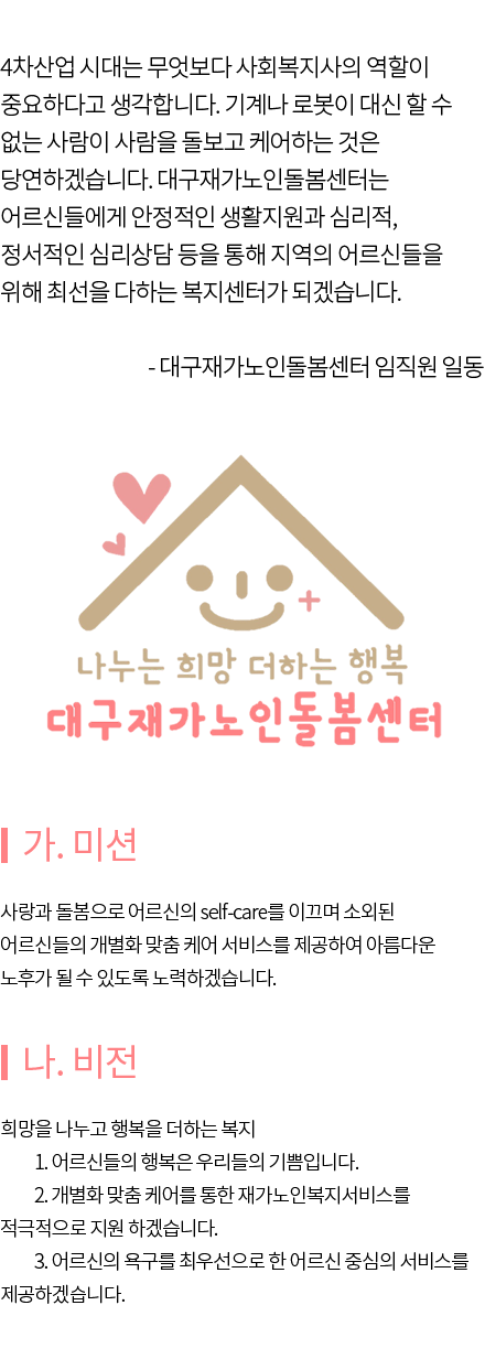 시설소개 재가노인지원서비스 노인맞춤돌봄서비스 정보마당 후원/자원봉사 인사말 법인소개 연혁 조직도 오시는 길 공지사항 갤러리 후원 안내 자원봉사 안내 시설소개 인사말 법인소개 연혁 조직도 오시는 길 재가노인지원서비스 노인맞춤돌봄서비스 정보마당 공지사항 갤러리 후원/자원봉사 후원 안내 자원봉사 안내 시설소개 시설소개 재가노인지원서비스 노인맞춤돌봄서비스 정보마당 후원/자원봉사 인사말 인사말 법인소개 연혁 조직도 오시는 길 인사말